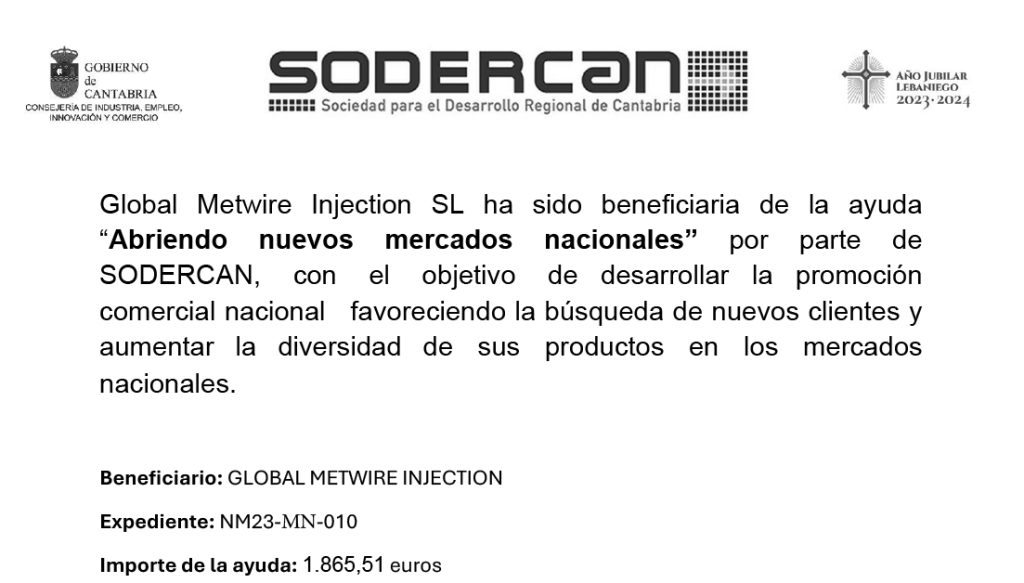 Global Metwire Injection SL ha sido beneficiaria de la ayuda “Abriendo nuevos mercados nacionales” por parte de SODERCAN, con el objetivo de desarrollar la promoción comercial nacional favoreciendo la búsqueda de nuevos clientes y aumentar la diversidad de sus productos en los mercados nacionales.